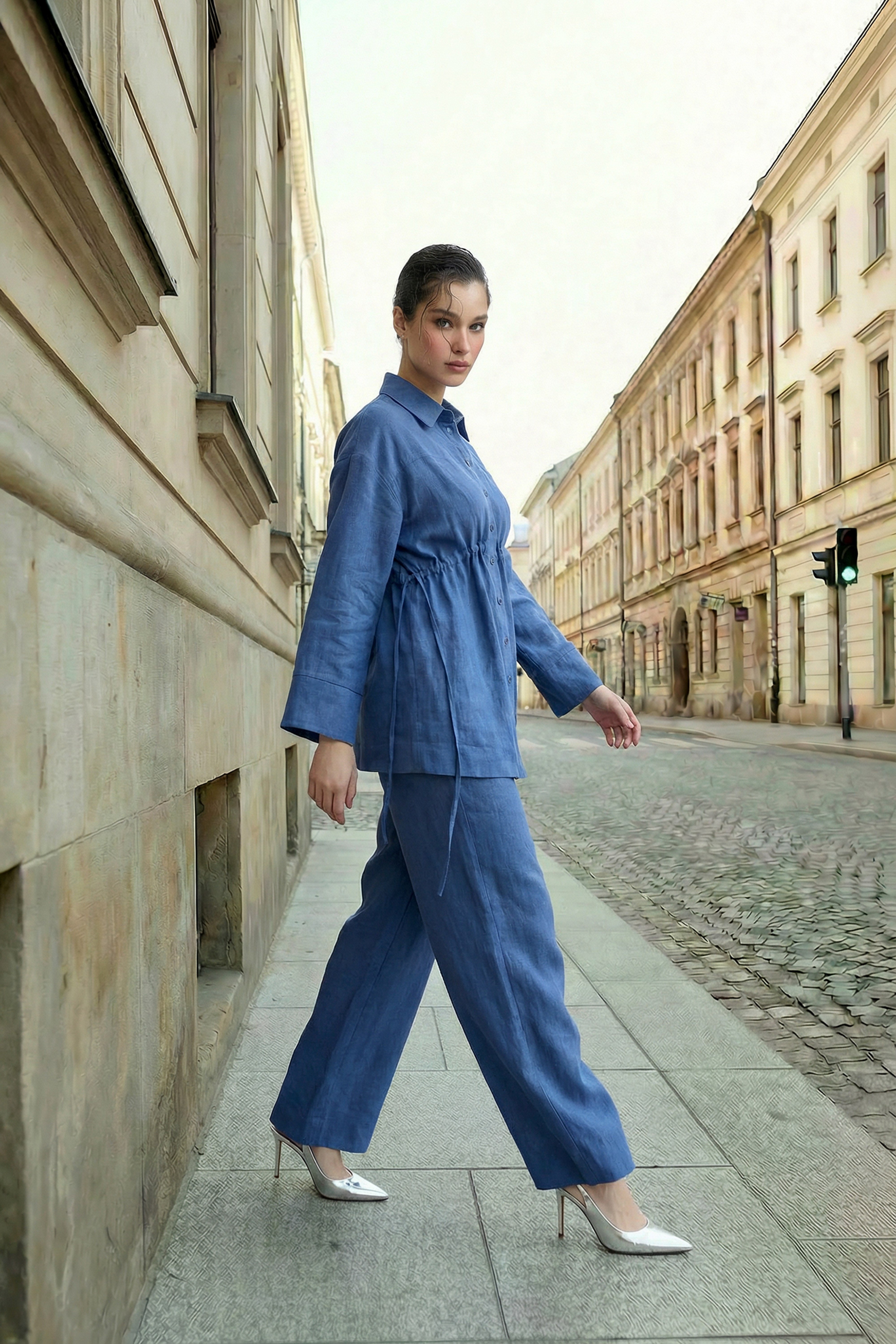 · Ürün Özelliği: Gömlek Yaka, Düğmeli, Düşük Kol, Kol Ucu Manşetli, Kesik Detaylı, Bel Tünelli, Bol Paça Pantolon, Cepli, Arka Lastikli, Ön Fermuarlı.