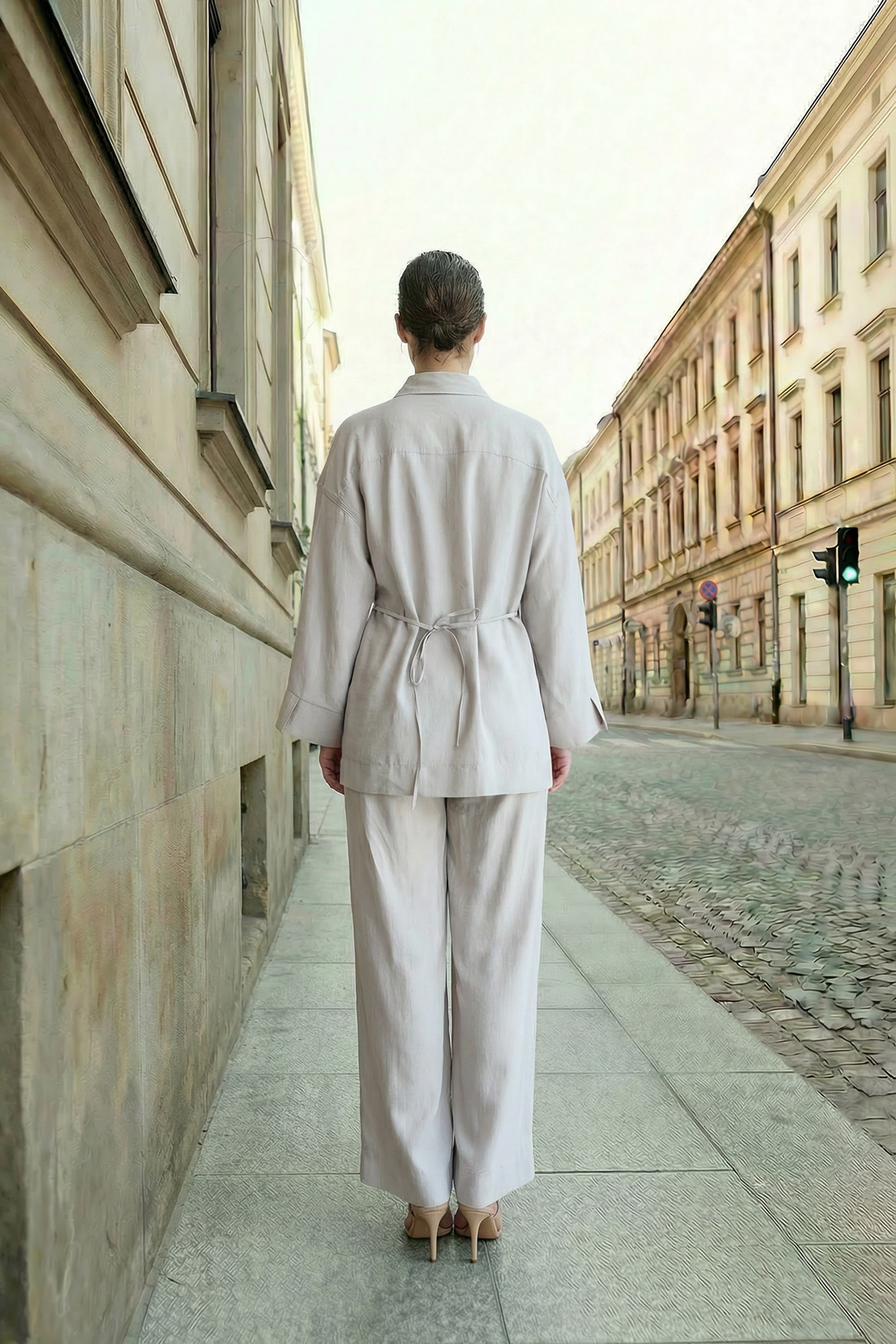 Günlük şıklığı konforla buluşturan bu takım, rahat kesim ceketi ve lastik bel pantolonu ile modern bir silüet sunar. Yüksek pamuk oranına sahip twill dokuma kumaşı sayesinde nefes alabilen ve tok bir yapı sağlar. Şehir hayatında hem birlikte hem ayrı ayrı kombinlenebilecek zamansız bir parçadır.