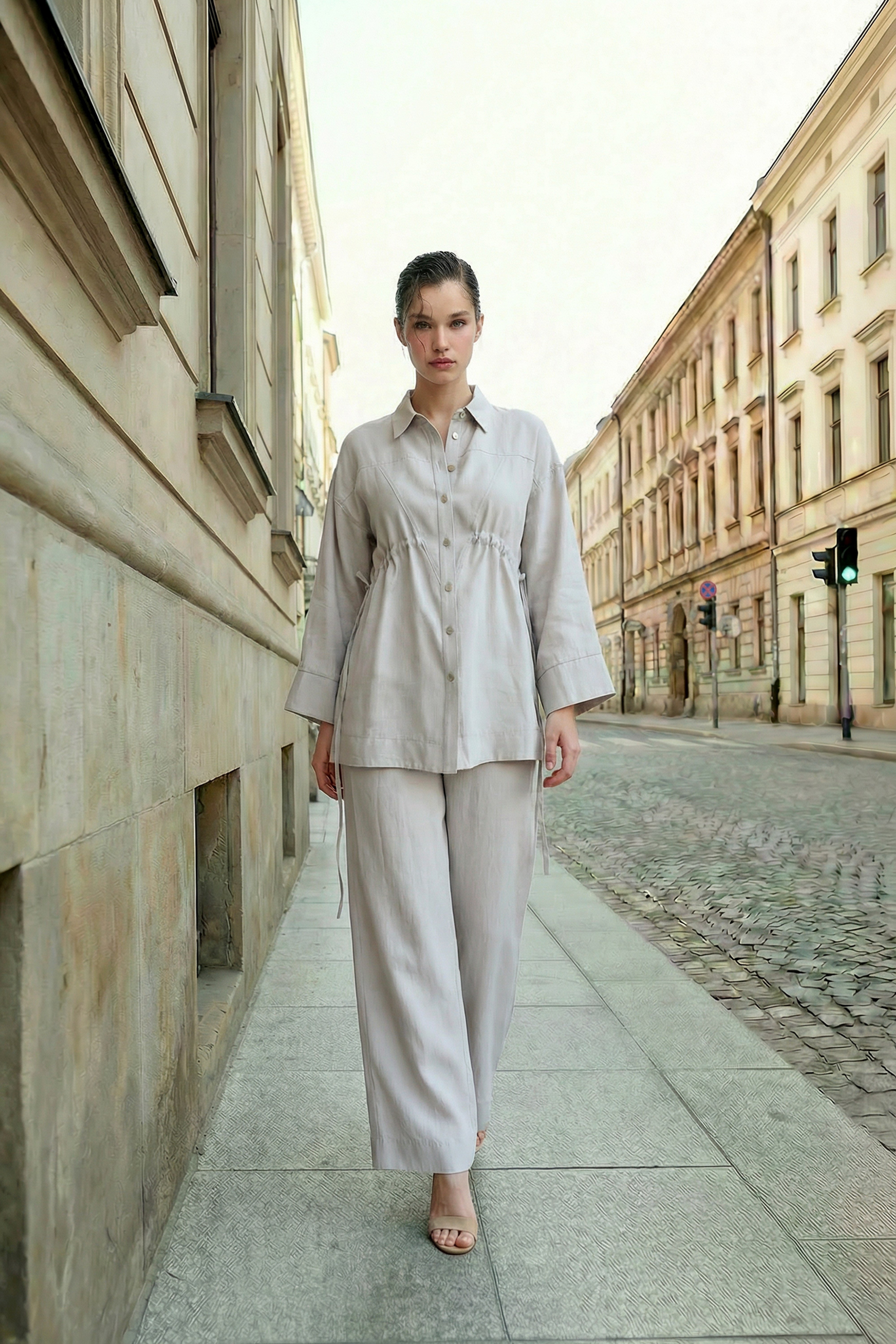 · Ürün Özelliği: Gömlek Yaka, Düğmeli, Düşük Kol, Kol Ucu Manşetli, Kesik Detaylı, Bel Tünelli, Bol Paça Pantolon, Cepli, Arka Lastikli, Ön Fermuarlı.
